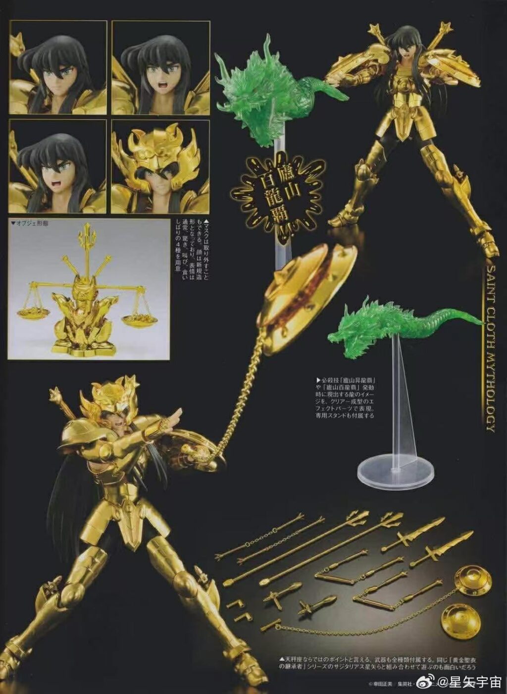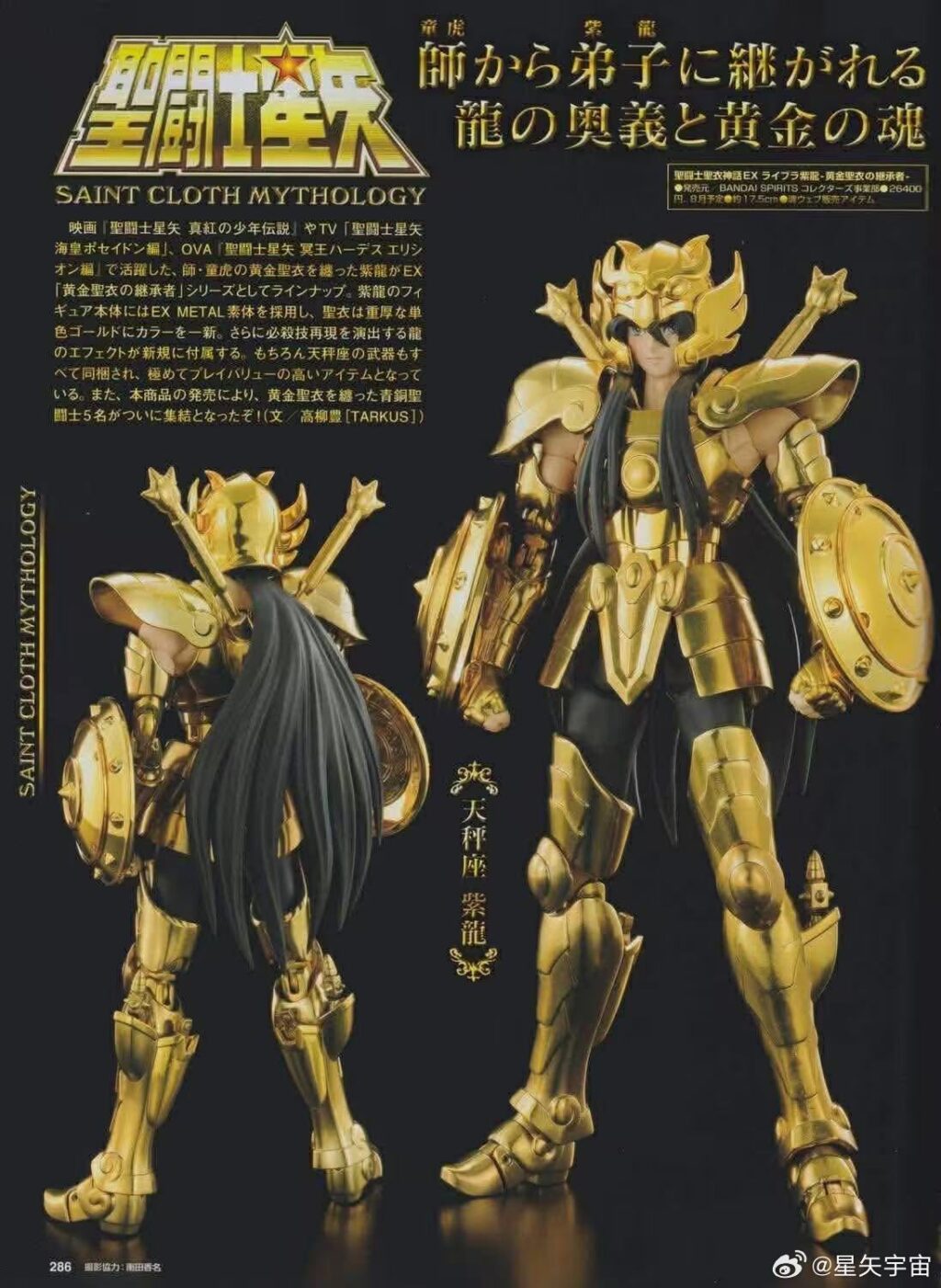 Shiryu, vestindo a Armadura de Ouro de seu mestre Dohko, que teve grande participação no filme "A Lenda dos Defensores de Atena", na série de TV "Saga de Poseidon" e no OVA "Saga de Hades - Fase Elíseos", entra na linha EX "Herdeiros das Armaduras de Ouro". O corpo da figura do Shiryu adota o corpo EX METAL, e a cor da armadura foi renovada para um dourado sólido e pesado. Além disso, um novo efeito de dragão que reproduz seus golpes especiais está incluído. Obviamente, todas as armas de Libra também estão na caixa, tornando-o um item com um valor de diversão extremamente alto. Com o lançamento deste produto, os 5 Cavaleiros de Bronze vestindo Armaduras de Ouro finalmente se reúnem!