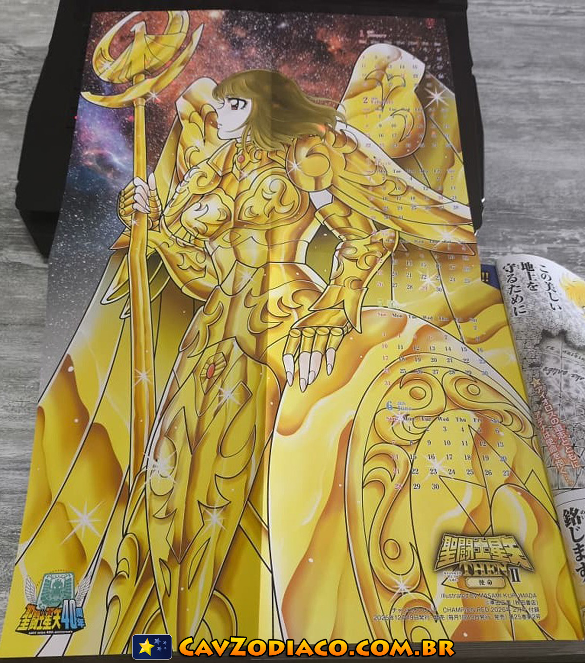 Além de todo o conteúdo que já divulgamos anteriormente, a edição física da revista trouxe um calendário de brinde, com a nova ilustração da deusa Atena com sua armadura feita pelo mestre Masami Kurumada.