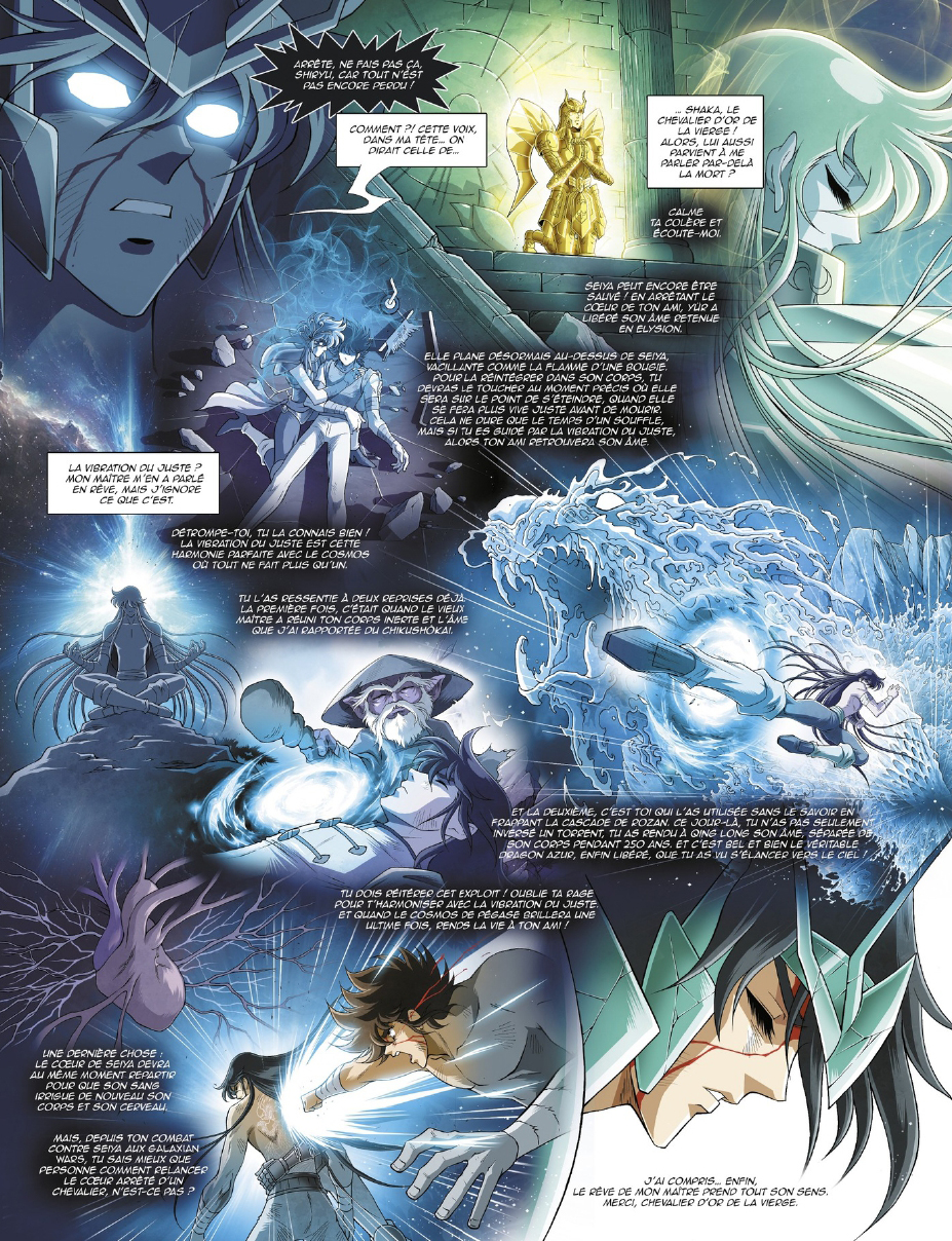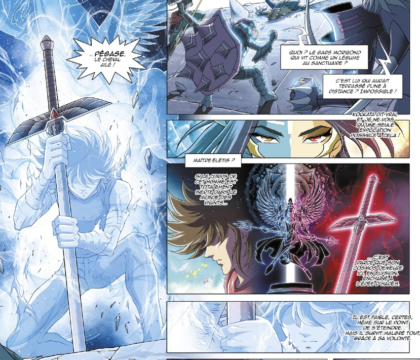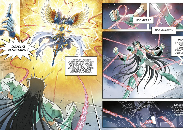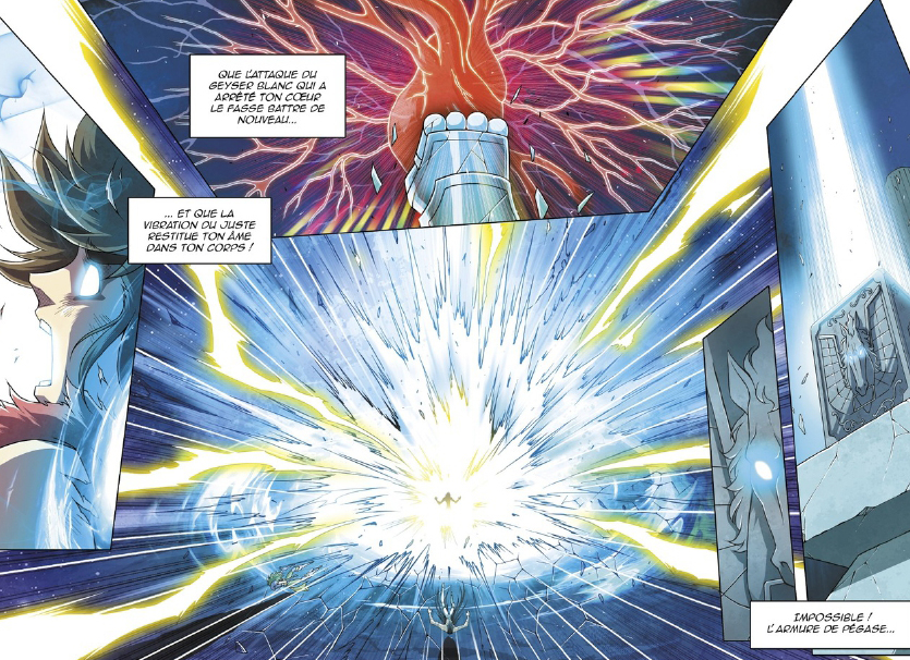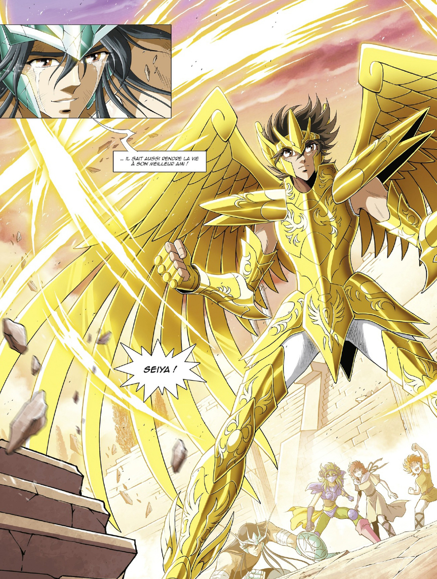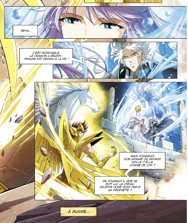 - A "Vibração do Justo" reinicia o coração de Seiya. A energia explode, revivendo Seiya, que se levanta vestindo a Armadura Divina de Pégaso em sua forma dourada. Atena confirma o milagre: Pégaso retornou à vida. O volume termina com Yür chocado ao ver sua profecia desfeita.