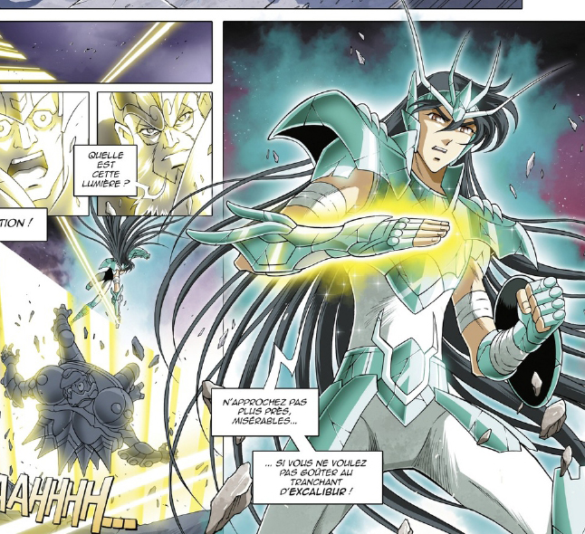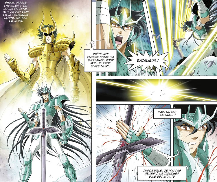 - Elétis é ferido. Diante disso, Shiryu tenta destruir a espada de Hades com a Excalibur, mas sem sucesso. Uma visão de Shura de Capricórnio explica que a espada de Hades é um "atributo" divino e não pode ser destruída por uma técnica humana.