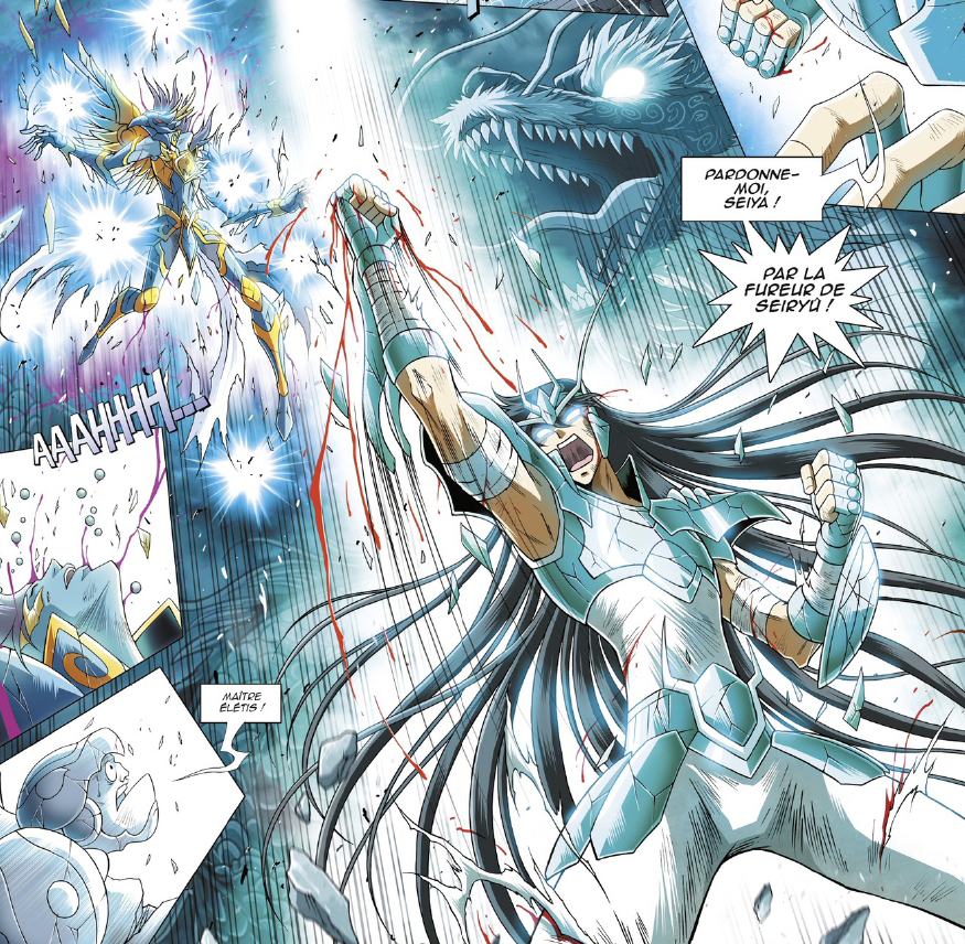 - Neste momento, Shiryu recebe uma visão de Shaka. Shaka explica o único caminho: Seiya pode ser salvo se Shiryu transferir sua própria força vital para ele, usando a "Vibração do Justo" para "dar vida ao seu amigo". Shiryu entende. Ele para de lutar contra Yür e pede ao inimigo que o ataque. Quando Yür o atinge com o "Geyser Branco", Shiryu canaliza toda a energia do golpe, combinada com sua própria força vital, e a transfere para Seiya. A tatuagem do dragão desaparece das costas de Shiryu.