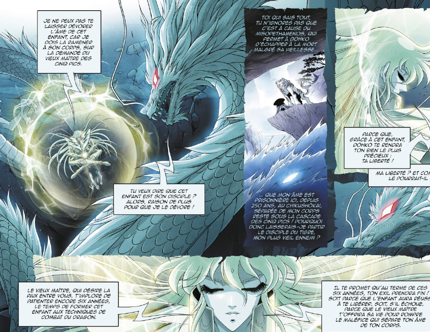 - O Dragão revela que ele é a entidade que salvou a vida de Shiryu quando criança, ligando sua alma à dele (o que formou a tatuagem do dragão nas costas de Shiryu). Shiryu aprende que seu verdadeiro poder não é o da fúria e destruição, mas o da "Vibração do Justo".