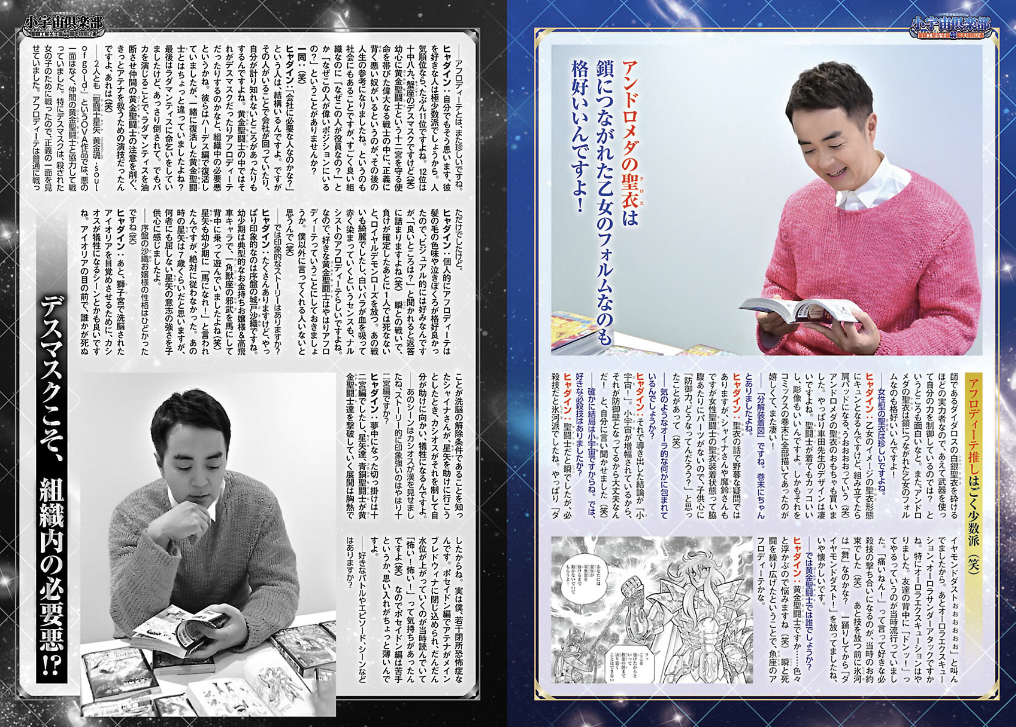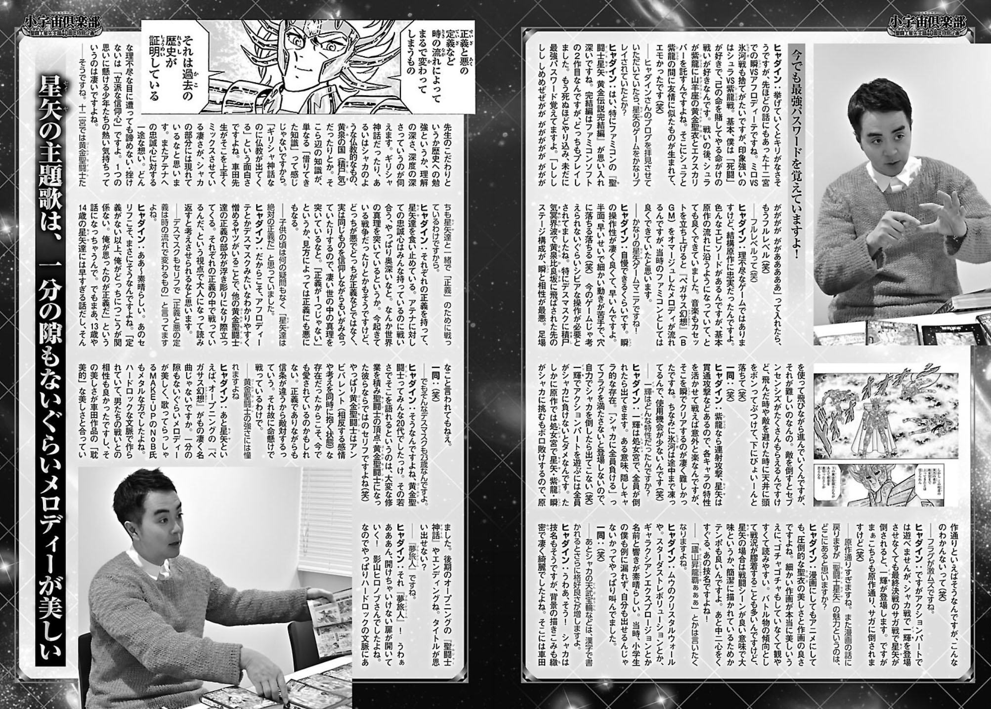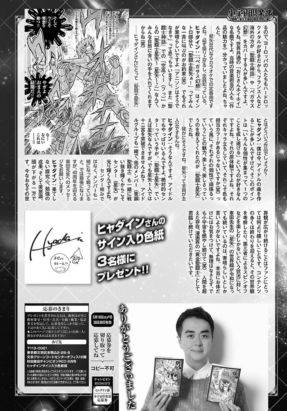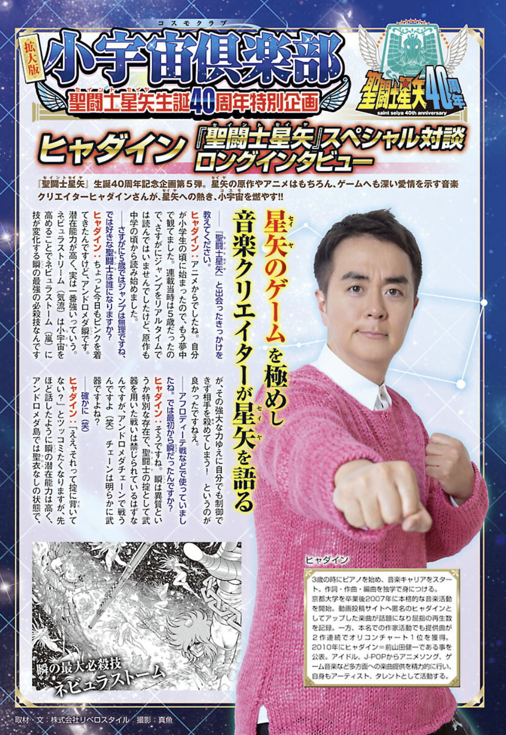 -A mensagem de Saint Seiya sobre diferentes personalidades a unirem-se em prol de um objetivo comum serviu de inspiração para o seu trabalho atual como compositor para grupos de idols. Ele vê Seiya como o "centro" (o protagonista absoluto) que brilha intensamente, mas que só consegue vencer graças ao trabalho de equipa e à dedicação de todos os outros Cavaleiros. A entrevista termina com Hyadain agradecendo o espírito de pesquisa de Kurumada e celebrando o fato de o "Mundo de Seiya" continuar vivo e em expansão.