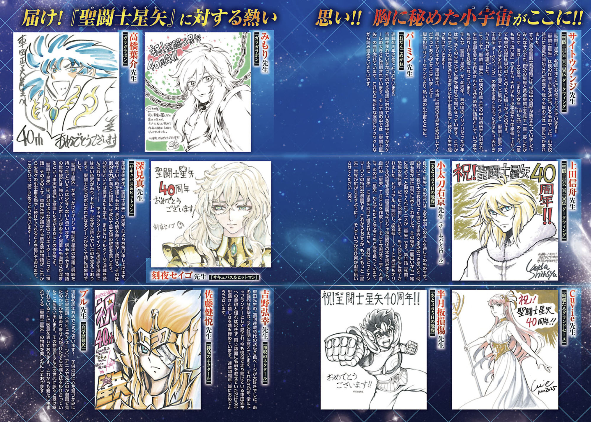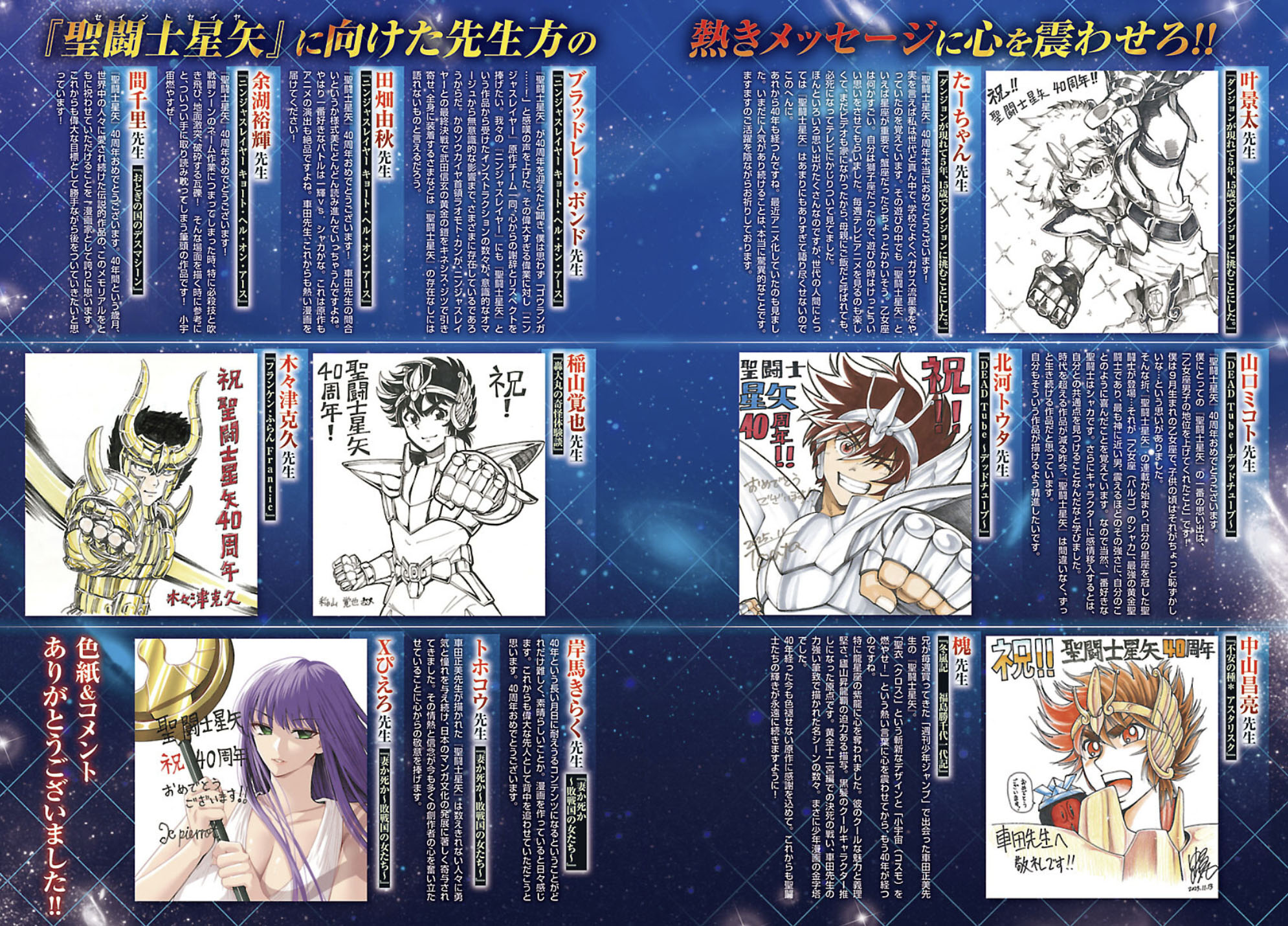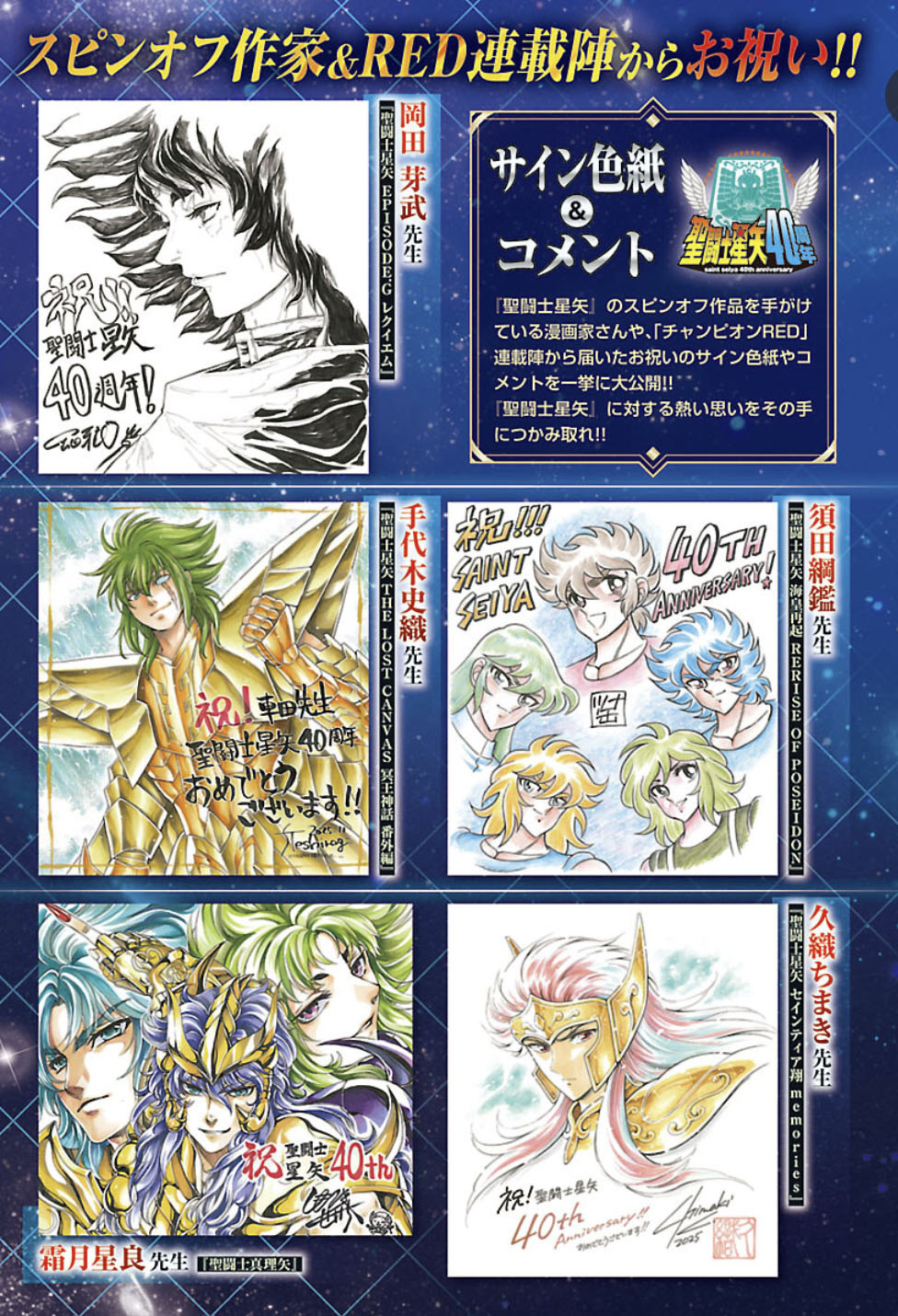Confira os cartões autografados (shikishis) e as mensagens de felicitações enviadas pelos mangakás que trabalham nas obras derivadas (spin-offs) de Saint Seiya e pelos artistas da revista Champion RED, parabenizando o mestre Masami Kurumada pelos 40 anos de Saint Seiya.
