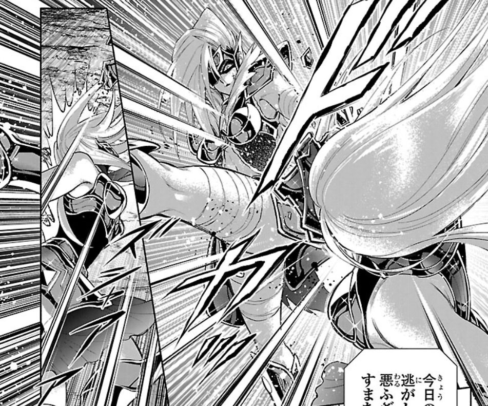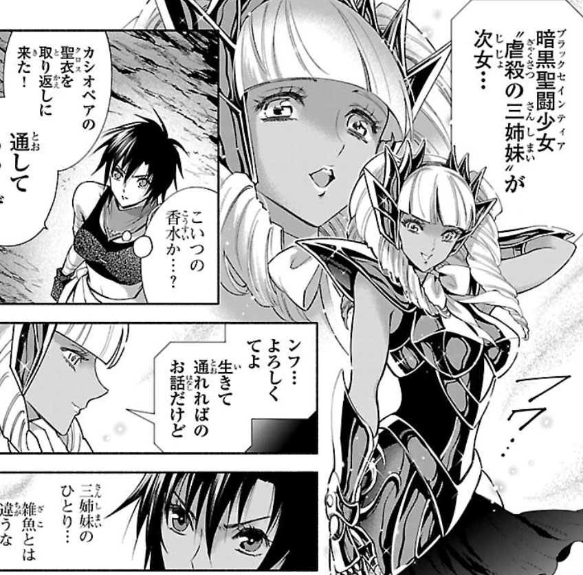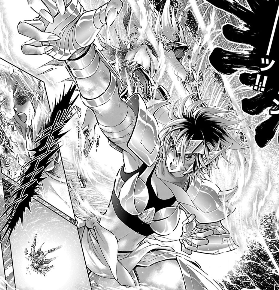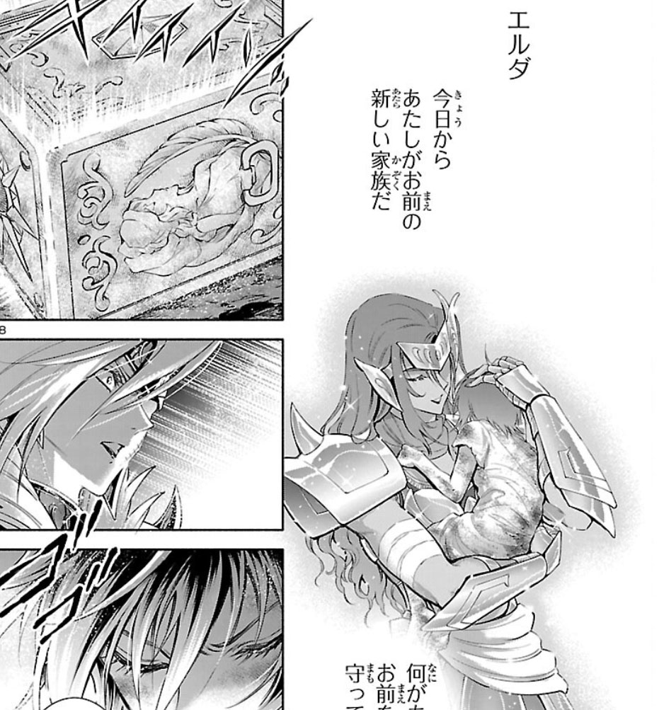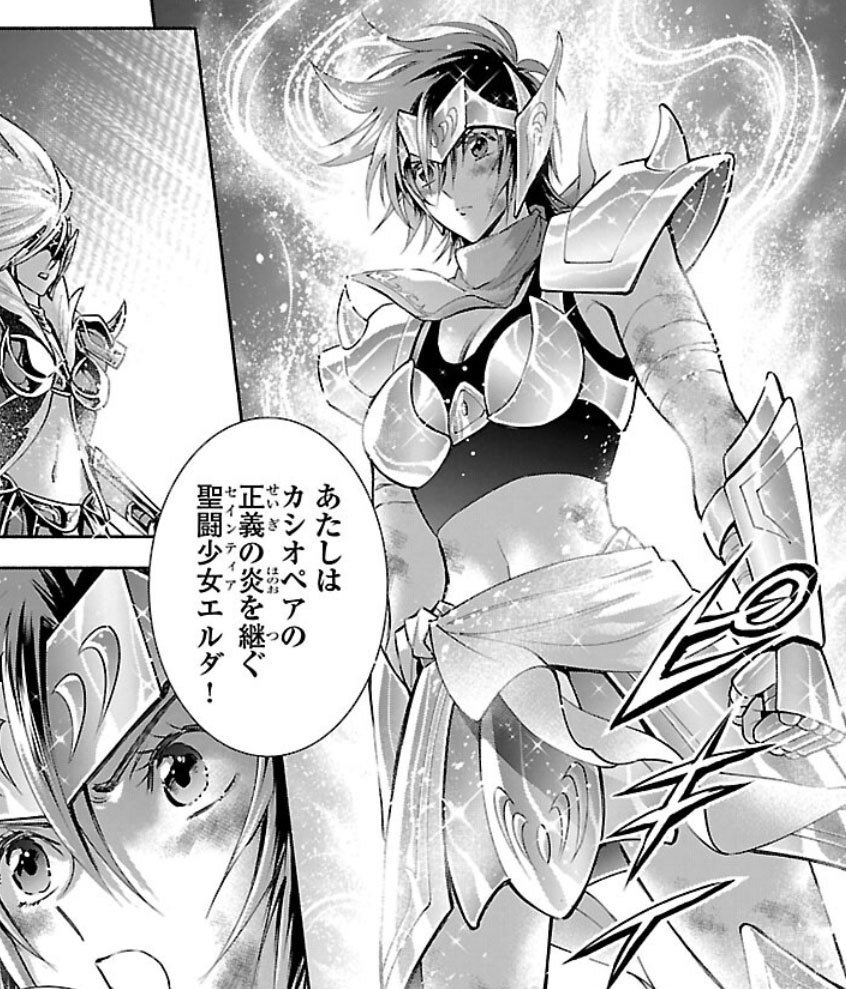 Recuperada, Elda interrompe a "festa" das Saintias Negras. A líder das irmãs desdenha dos laços de amizade de Elda e admite ter assassinado Rebecca, embora nem se lembrasse do nome dela. Enfurecida, Elda desperta seu Cosmo de justiça, derrota as irmãs com seu golpe e recupera sua armadura. Antes de partir, ela encoraja Crown a encontrar um novo propósito para sua vida. O capítulo termina com Elda retornando à Academia Sagrada.