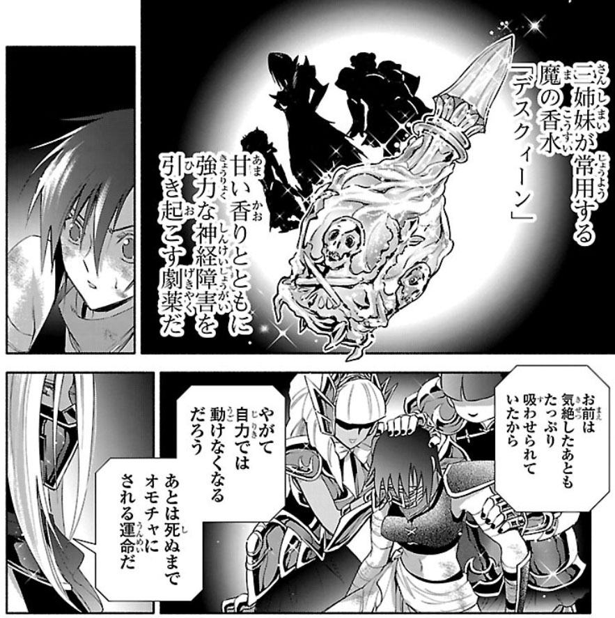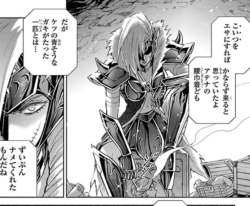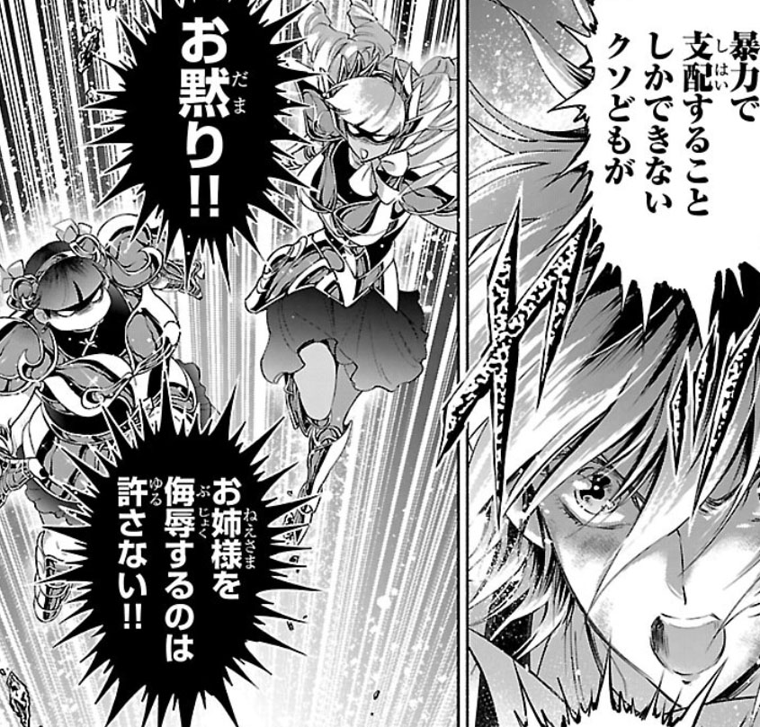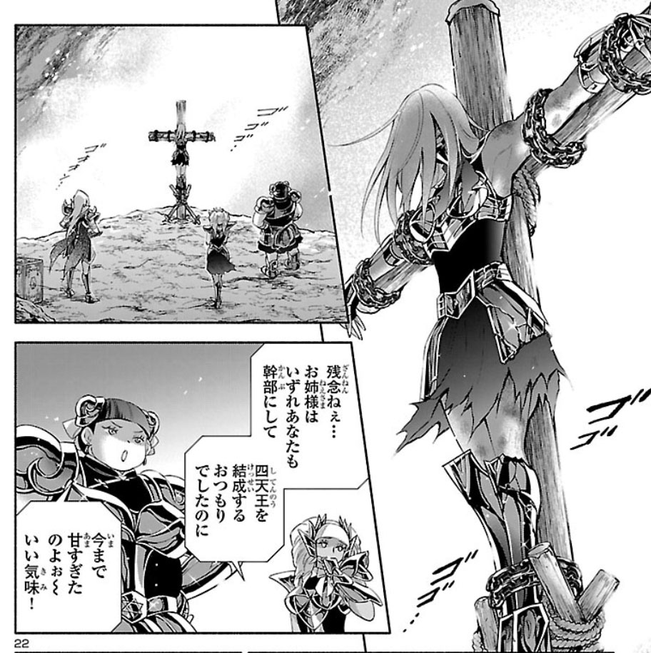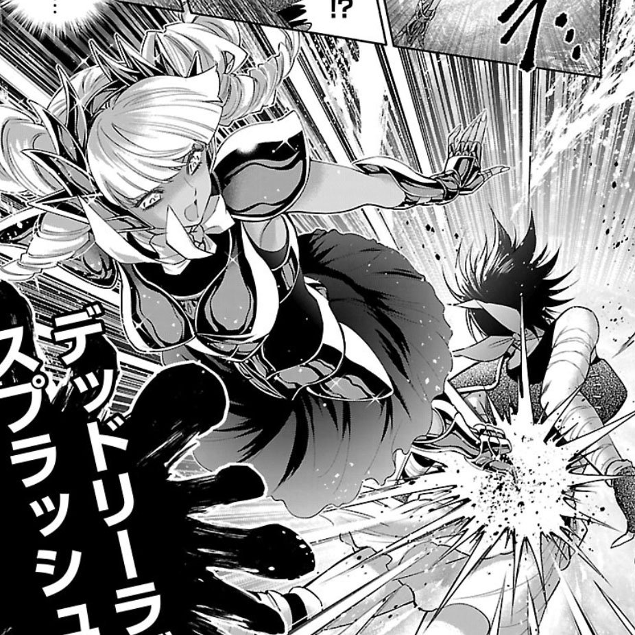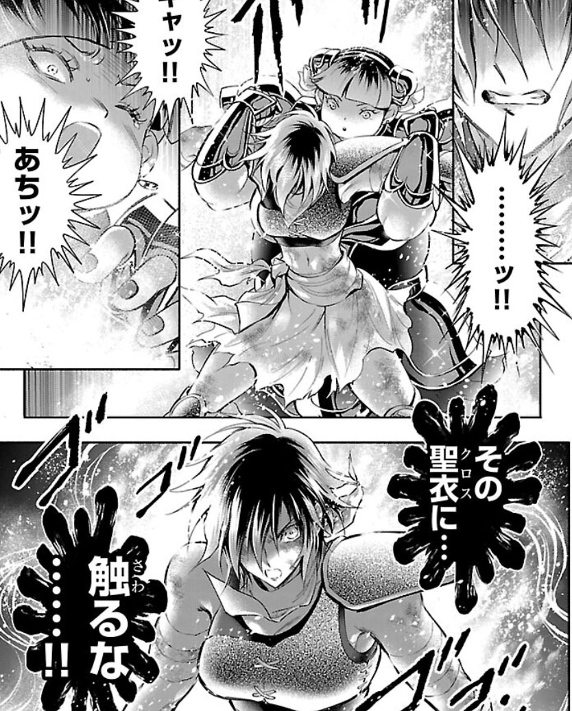 Recuperada, Elda interrompe a "festa" das Saintias Negras. A líder das irmãs desdenha dos laços de amizade de Elda e admite ter assassinado Rebecca, embora nem se lembrasse do nome dela. Enfurecida, Elda desperta seu Cosmo de justiça, derrota as irmãs com seu golpe e recupera sua armadura. Antes de partir, ela encoraja Crown a encontrar um novo propósito para sua vida. O capítulo termina com Elda retornando à Academia Sagrada.