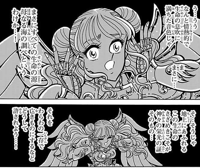 Com a derrota de Pólux, os sete Generais Marinas finalmente se reúnem diante de Nêmesis. Sorento de Sirene utiliza sua flauta para tocar a "Rapsódia do Oceano" (Oceans Rhapsody), combinando o cosmo dos sete Marinas. A música toca a alma de Nêmesis, fazendo-a questionar seu julgamento e lembrar-se da beleza da vida e dos desejos de sua amiga Justitia, que jamais desejaria tamanha destruição.